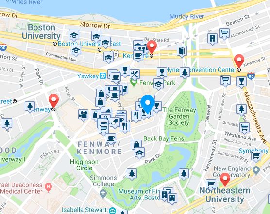 Fenway ---- 非常适合NEU,Berkeley,BU的同学在此租房。附近的Boston University和Northeastern University都在步行范围内。且步行5分钟范围之内有各种超市,健身房,邮局,冰激淋店,银行,便利超市等。著名的波士顿红袜队的主场也在这里(Fenway Park),因此Fenway Park也是著名的酒吧聚集地。附近地铁主要有绿线。由于Fenway离市中心比较近。非常安全,环境优美。